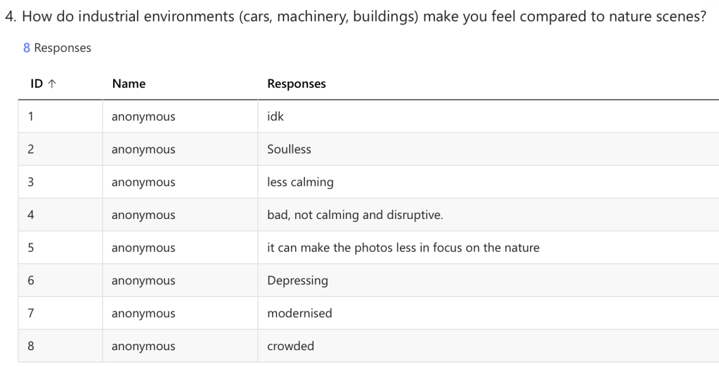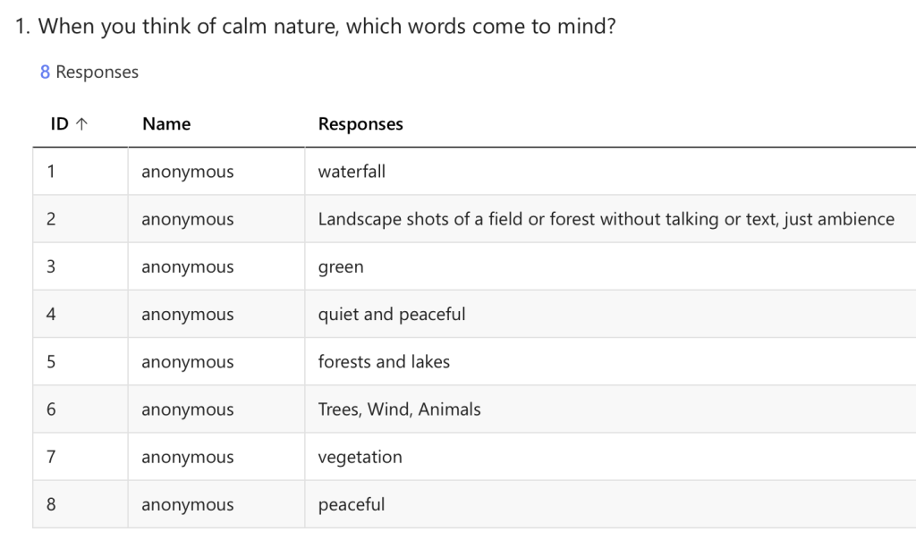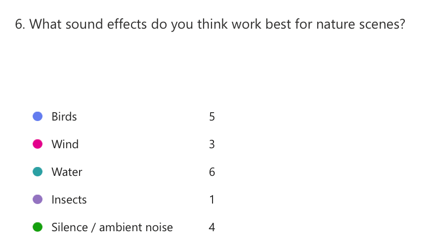 I am planning on using all of these for audio but its good to see peoples opinion on what works best. The most preferred audio is water which mean I’m going to adjust my plan and make a scene with water. And from these results I will be using all of these but maybe leaning away from insects.