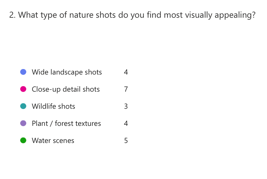 I asked this question so I could understand what peoples perfered image of nature is and with the answers that have gained I now know what shots to film to make the best video for my audinece.
