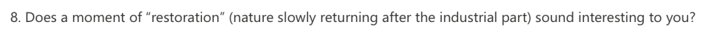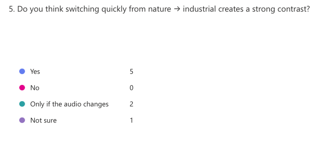Most people believe that a qwick trasition from nature to an industral scene will have a strong contrast and some think the audio must change aswell which is what I’m planning on doing.