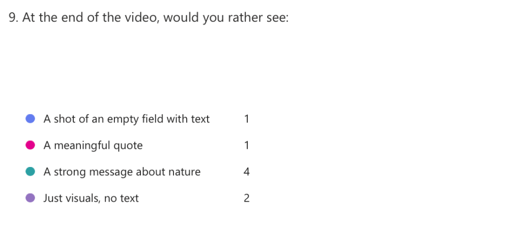 To gain information on what my audience what’s to see so I did a form which asked 9 specific questions to allow me to see exactly what people want for a enviromental awareness video.